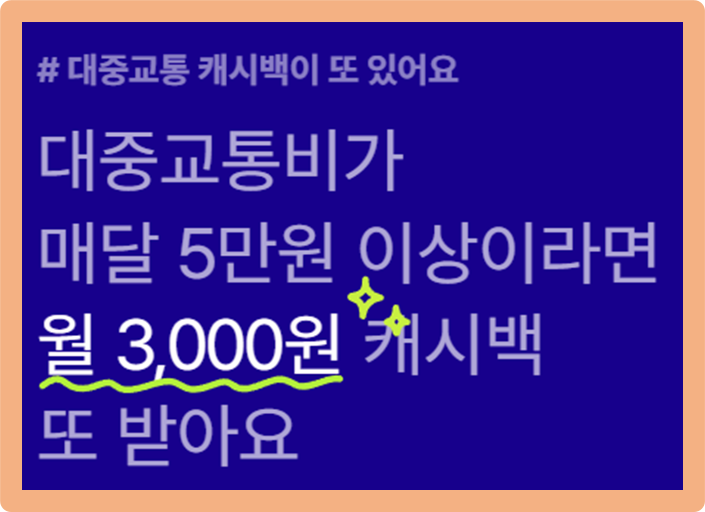 이게 끝이 아니에요.만약 매달 5만원 이상의 대중교통 비용이 발생한다면, 매월 3천원의 캐시백을 추가적 지급받는다고 해요. 즉, 쓰면 쓸수록 캐시백 혜택이 늘어난다는 것이죠.