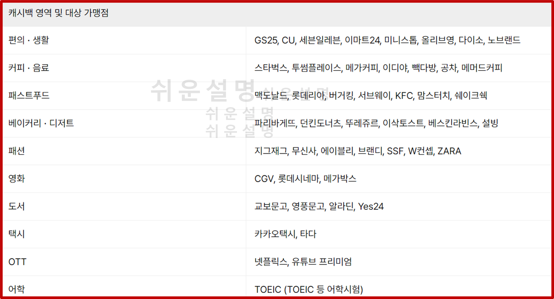 지에스25, CU, 세븐일레븐 편의점, 올리브영, 맥도날드, 버거킹, 파리바게뜨, 다이소, 스타벅스, 다이소, 메가커피, 던킨도너츠, CGV, 롯데시네마, 카카오택시와 같이 편의, 생활, 커피, 패스트푸드, 영화, 도서 등 다양한 영역에서 캐시백을 적립받을 수 있어요.