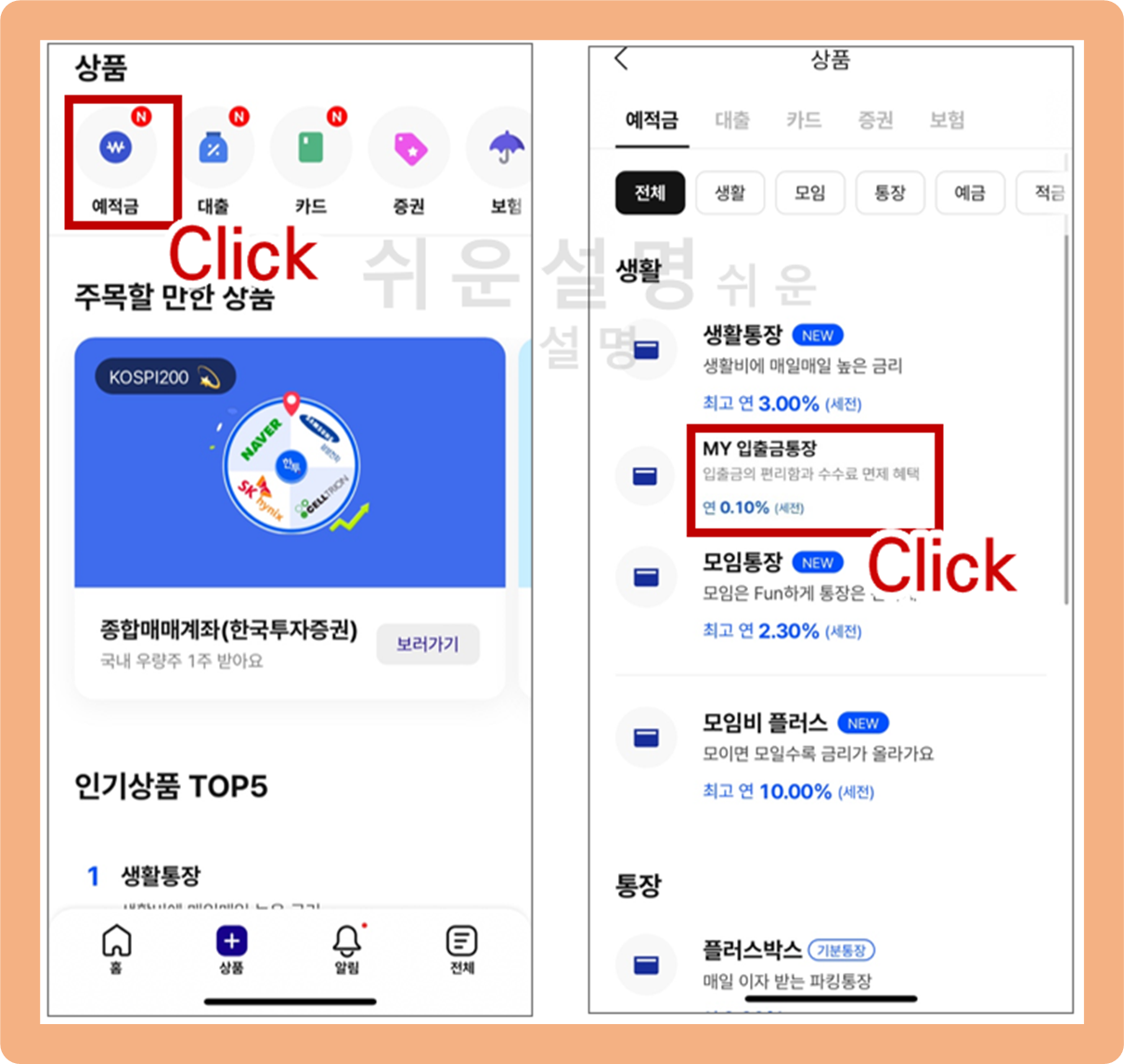 이 중 `MY입출금통장` 메뉴를 클릭해주시면 돼요.