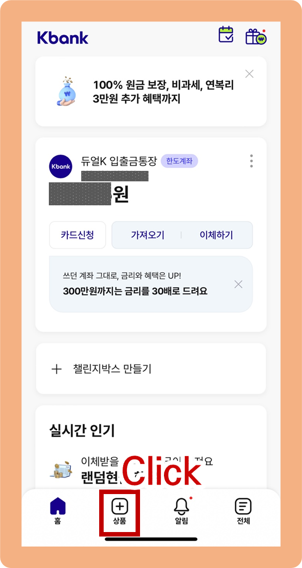 케이뱅크 어플을 실행하시면 여러분이 보유하고 있는 계좌 및 금액이 메인 화면에 나타날거에요. 여기서 화면 하단에 보이는 '상품' 메뉴를 클릭해주세요.