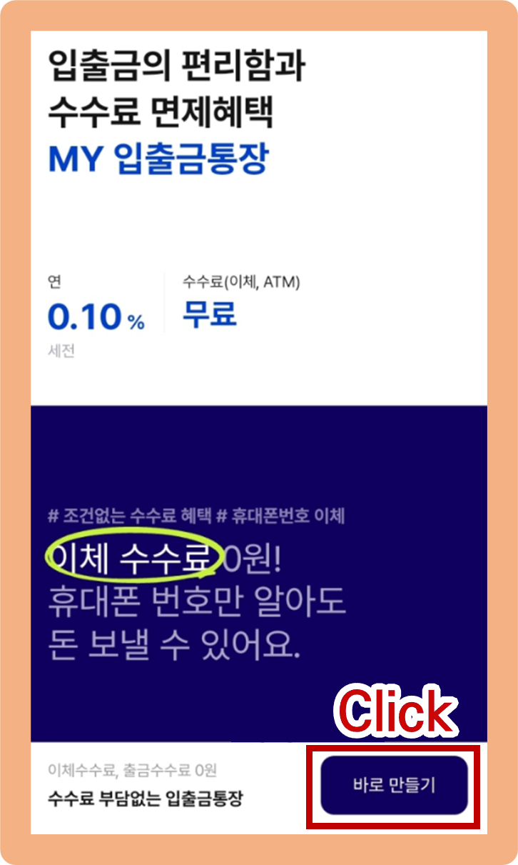 그럼 'MY입출금통장'의 금리, 혜택 등에 대한 안내 사항이 나올텐데, 안내 사항을 간단히 확인해주신 후 화면 오른쪽 아래에 있는 '바로 만들기' 버튼을 클릭해주세요.