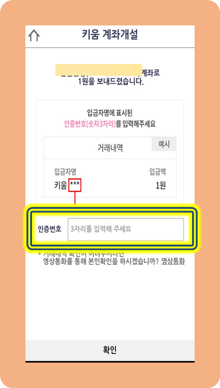 1원을 보낸사람의 이름으로 인증번호 3자리 확인 후 입력하면 돼요.