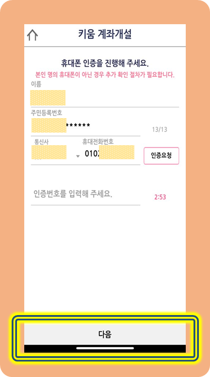 문자 본인 인증을 하신 후 다음을 클릭해주세요.