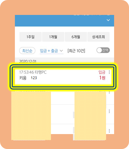 계좌에서 확인하시면 1원이 입금된 것을 볼 수 있어요.