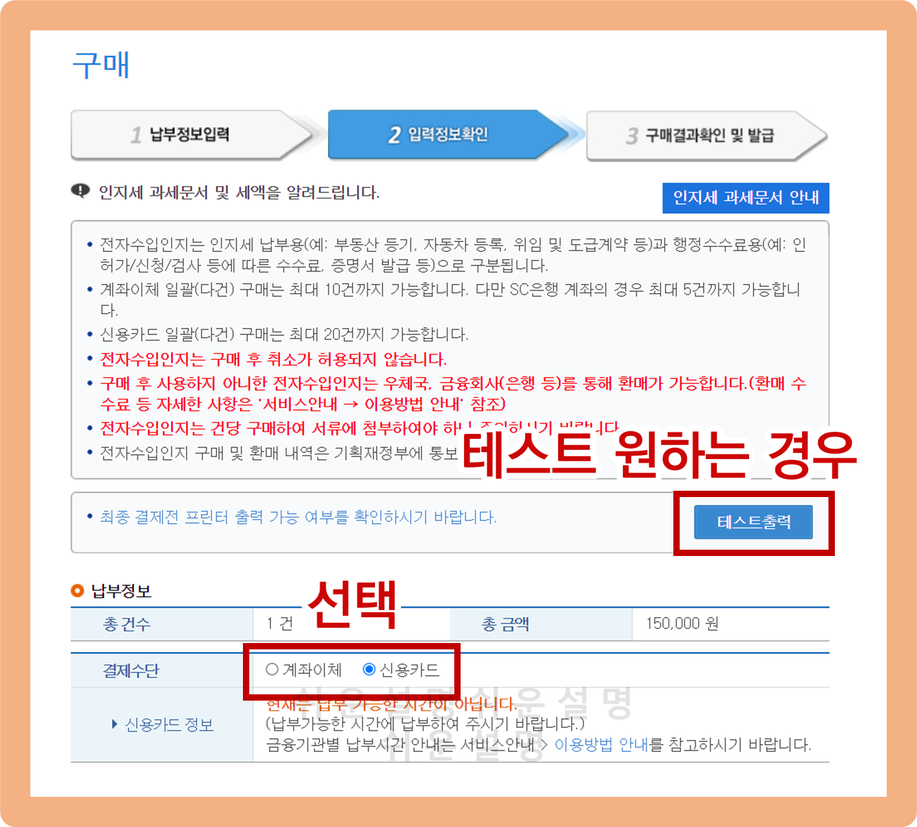 인지세 납부 화면을 테스트 출력을 하고 싶은 경우 '테스트 출력'을 통해 해주시면 되구요.그 다음 납부금액을 결제해주시면 인지세 납부가 완료돼요.(결제 가능 시간 : 00시 30분~22시.)