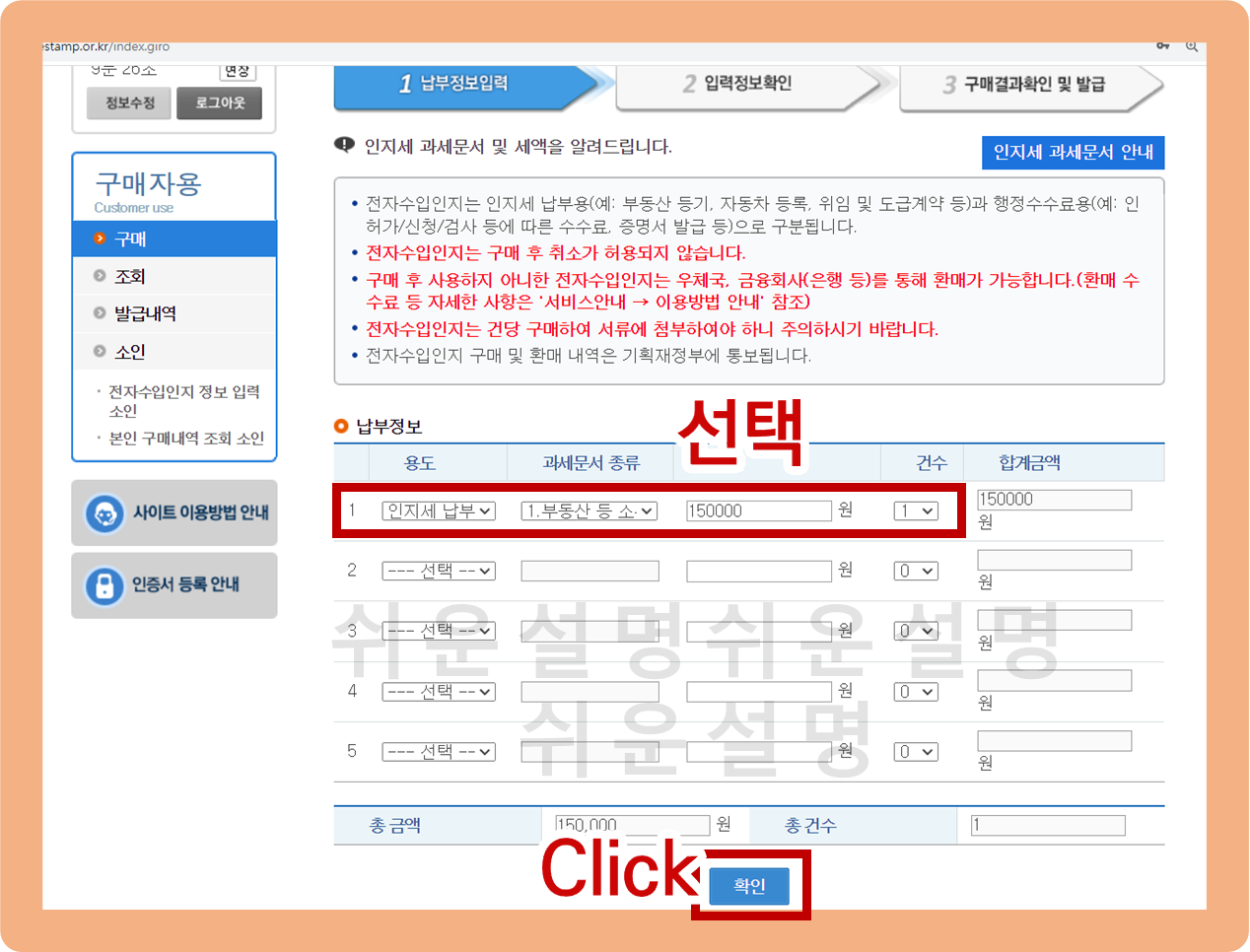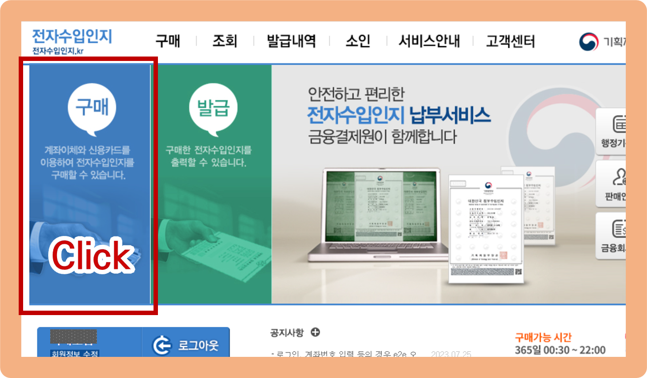 인터넷 전자 인지세 납부 방법 - '구매' 메뉴 클릭