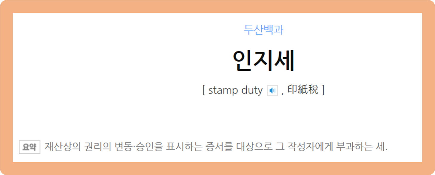 우선 인지세의 사전적 의미를 찾아보면, 재산상의 권리 변동 및 승인 등을 표시하는 증서를 대상으로 부과하는 세금이라고 나와 있네요.