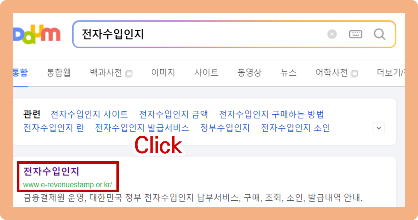 먼저 검색창에 '전자수입인지' 라고 입력 후 검색하면, 가장 상단에 웹사이트가 하나 나오는데, 이 곳을 클릭해주세요.