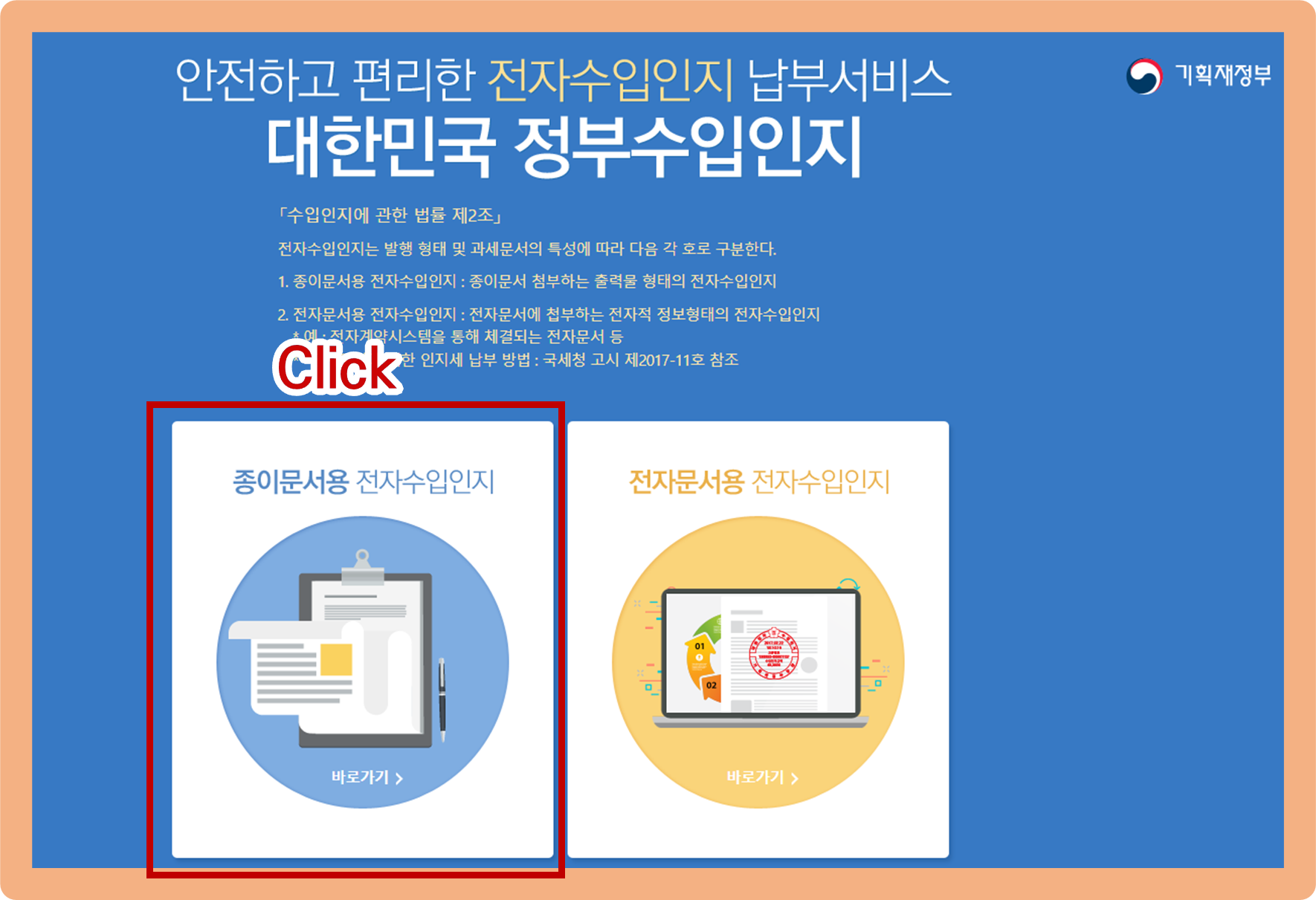 홈페이지에 들어 오면 바로 두 개의 메뉴가 보일텐데, 이 중 '종이문서용 전자수입인지'를 클릭해주세요.