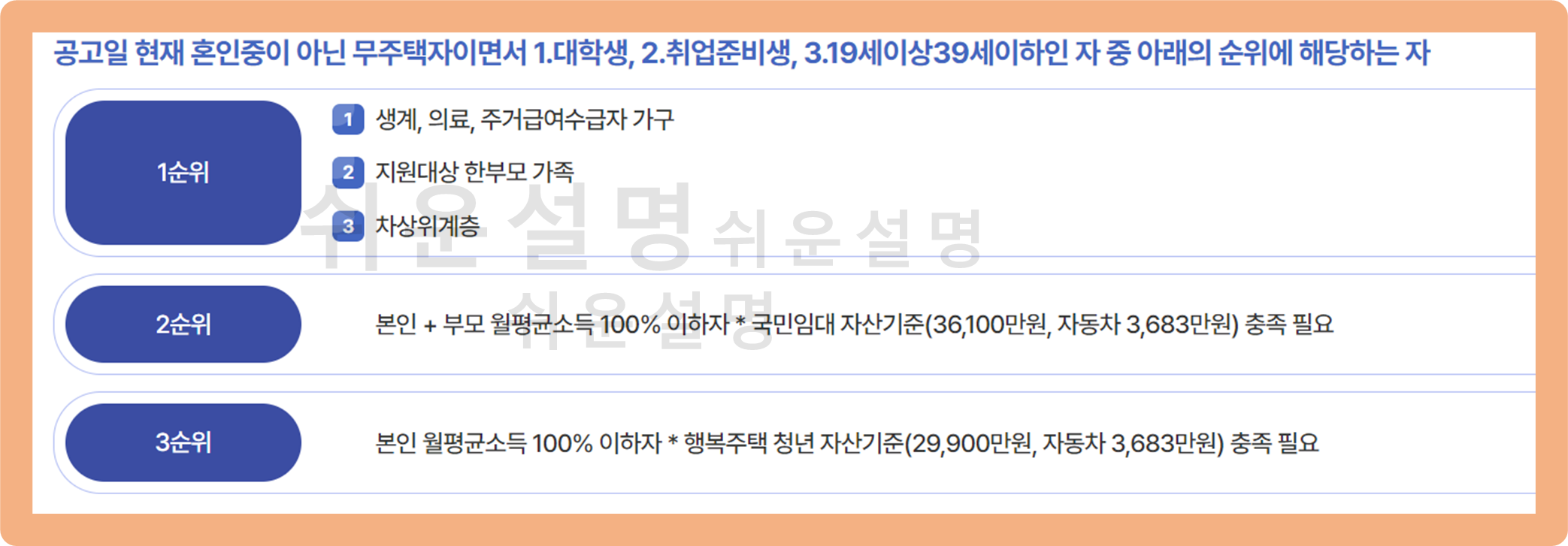 - 1순위 : 생계급여, 의료급여, 주거급여 수급자 가구 / 한부모 가족 / 차상위 계층 중 1가지에 해당할 경우