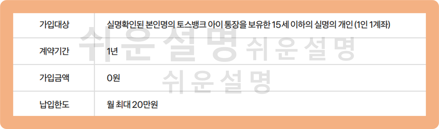 토스뱅크 아이적금은 만 토스뱅크 아이 통장을 보유한 15세 이하인 분들의 경우 가입 가능하며, 가입 기간은 1년으로 정해져 있어요.