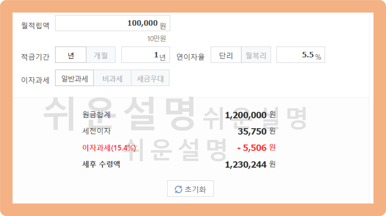 아이적금을 매월 10만원 납입 조건으로 가입할 경우, 만기 해지 시 세전 이자 35,750원 세후 이자 30,244원을 수령하게 돼요. 이제는 족발까지도 사먹을 수 있겠네요.