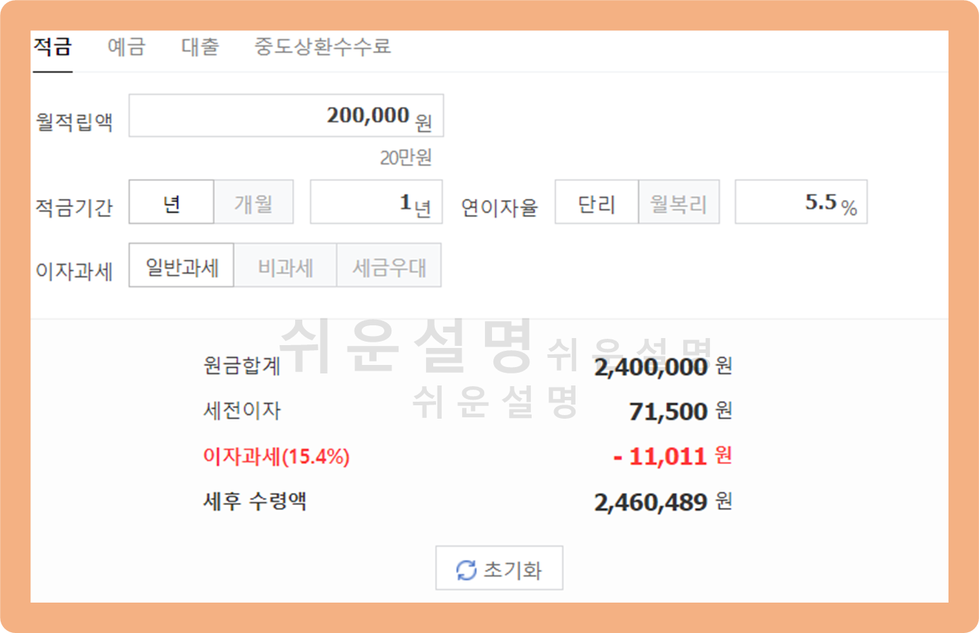 아이적금을 매달 20만원 납입 조건으로 신청한다면, 만기 해지 시 세전 71,500원, 세후 이자 60,489원을 수령하게 돼요.