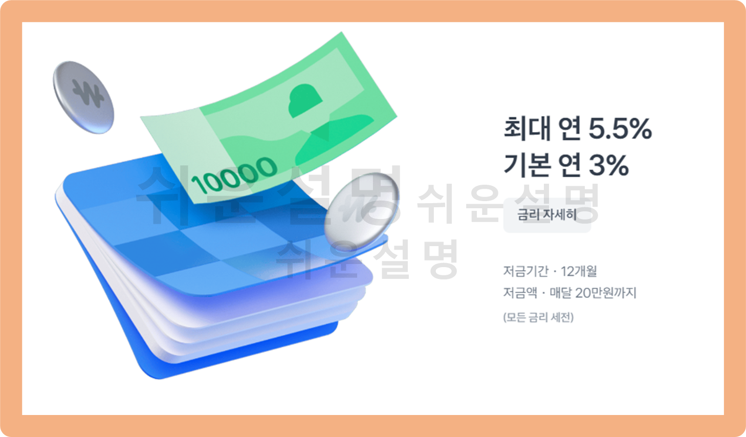 만약 가입기간 동안 꾸준히 매월 자동이체를 성공한다면, 연 2.5%p의 우대 금리가 추가적으로 적용되어 5.5%의 금리 혜택을 받을 수 있게 돼요.