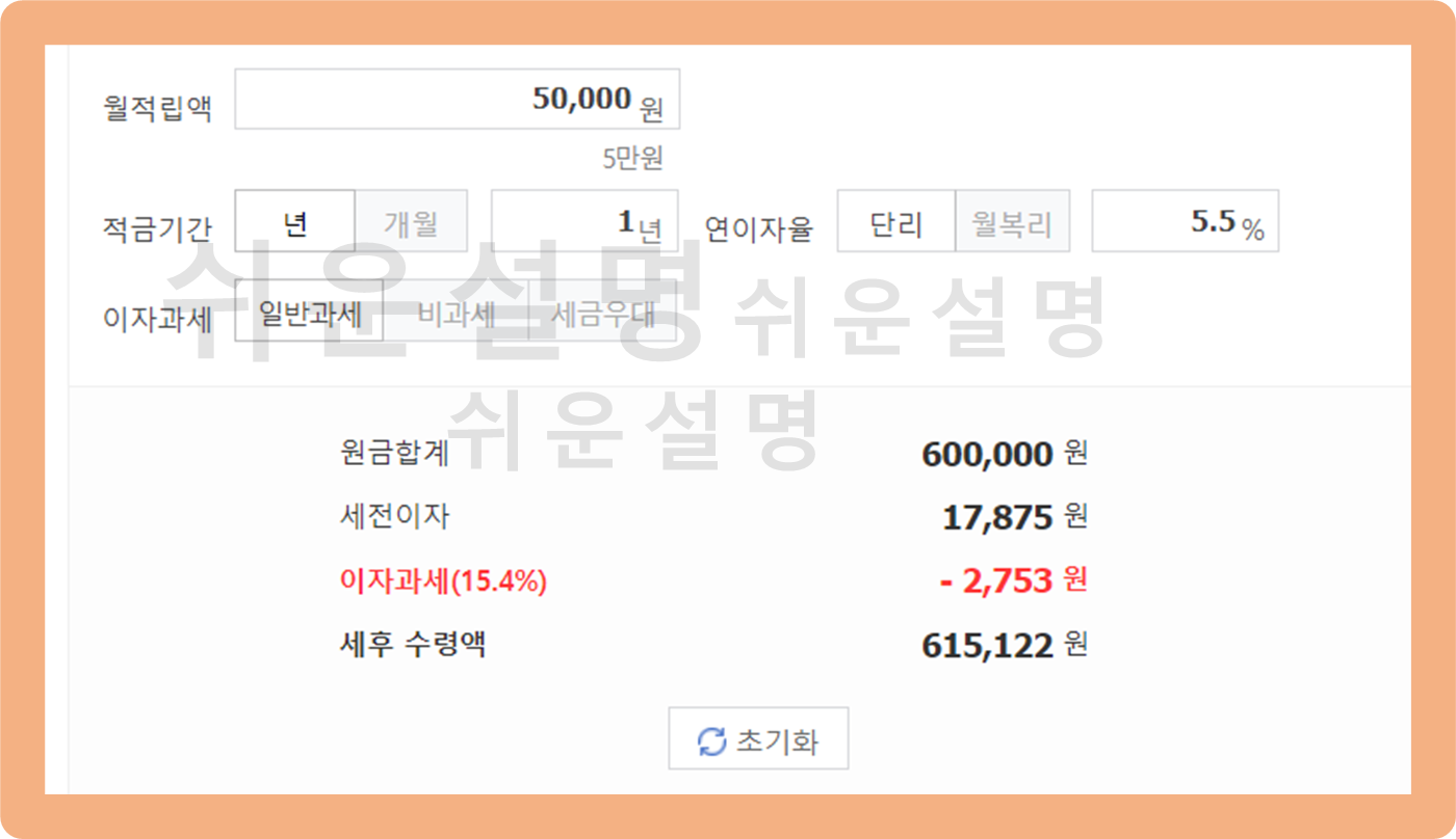 아이적금 상품을 매월 5만원 납입 조건으로 가입할 경우, 만기 해지 시 세전 이자 17,875원, 세후 이자 15,122원을 수령하게 대요. 치킨 1마리를 사먹을 수 있는 금액이죠.