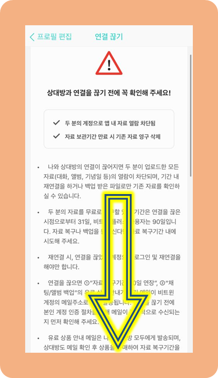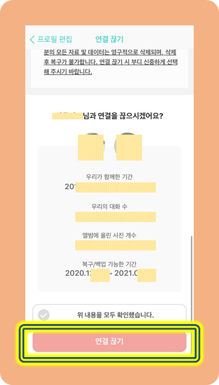 한 번 연결을 끊으면 지금까지 모은 귀중한 자료들이 모두 지워지기 때문에 주의사항 목록이 길어요.