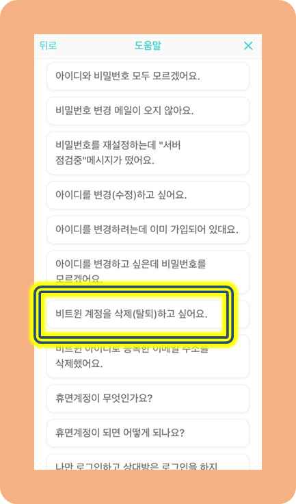비트윈 계정을 탈퇴하고 싶어요라는 버튼을 클릭해주세요.