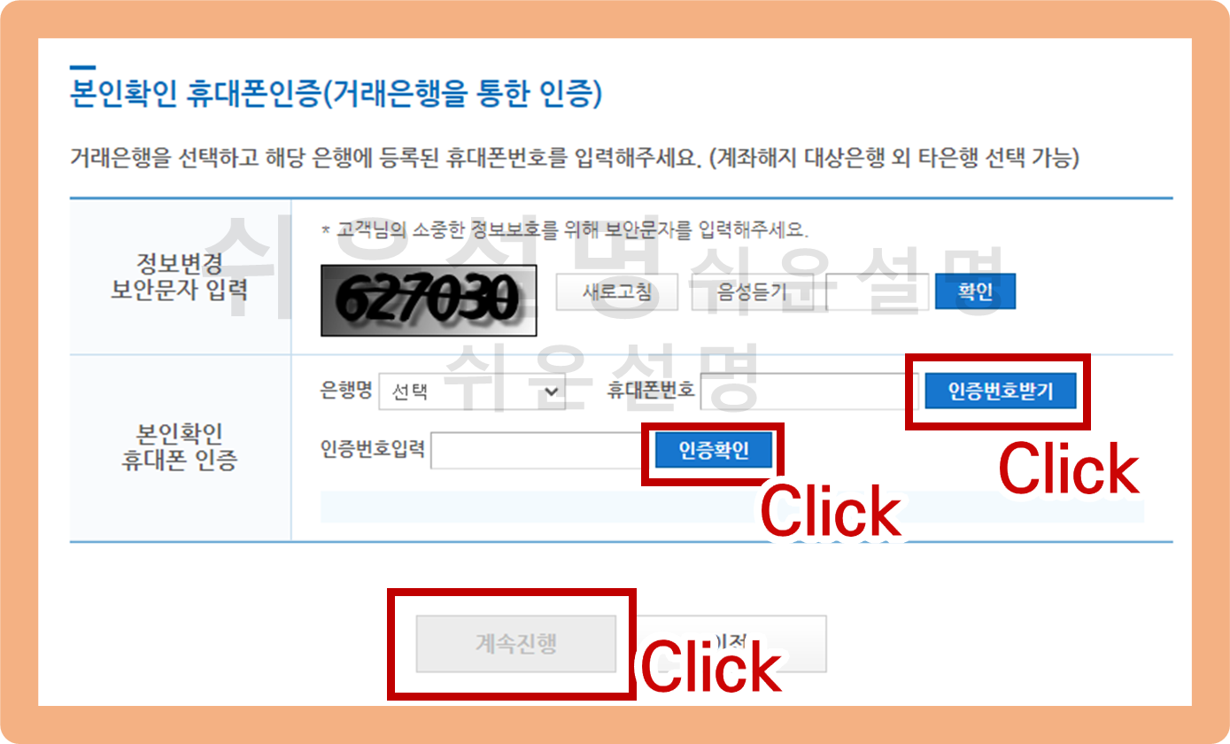 여러분이 사용중인 은행을 선택한 뒤, 본인 명의의 핸드폰 번호를 입력 후 '인증번호받기'를 클릭하면 해당 핸드폰으로 문자가 전송될 거예요. 문자로 발송된 인증번호를 입력 후 '계속진행' 버튼을 눌러주세요.