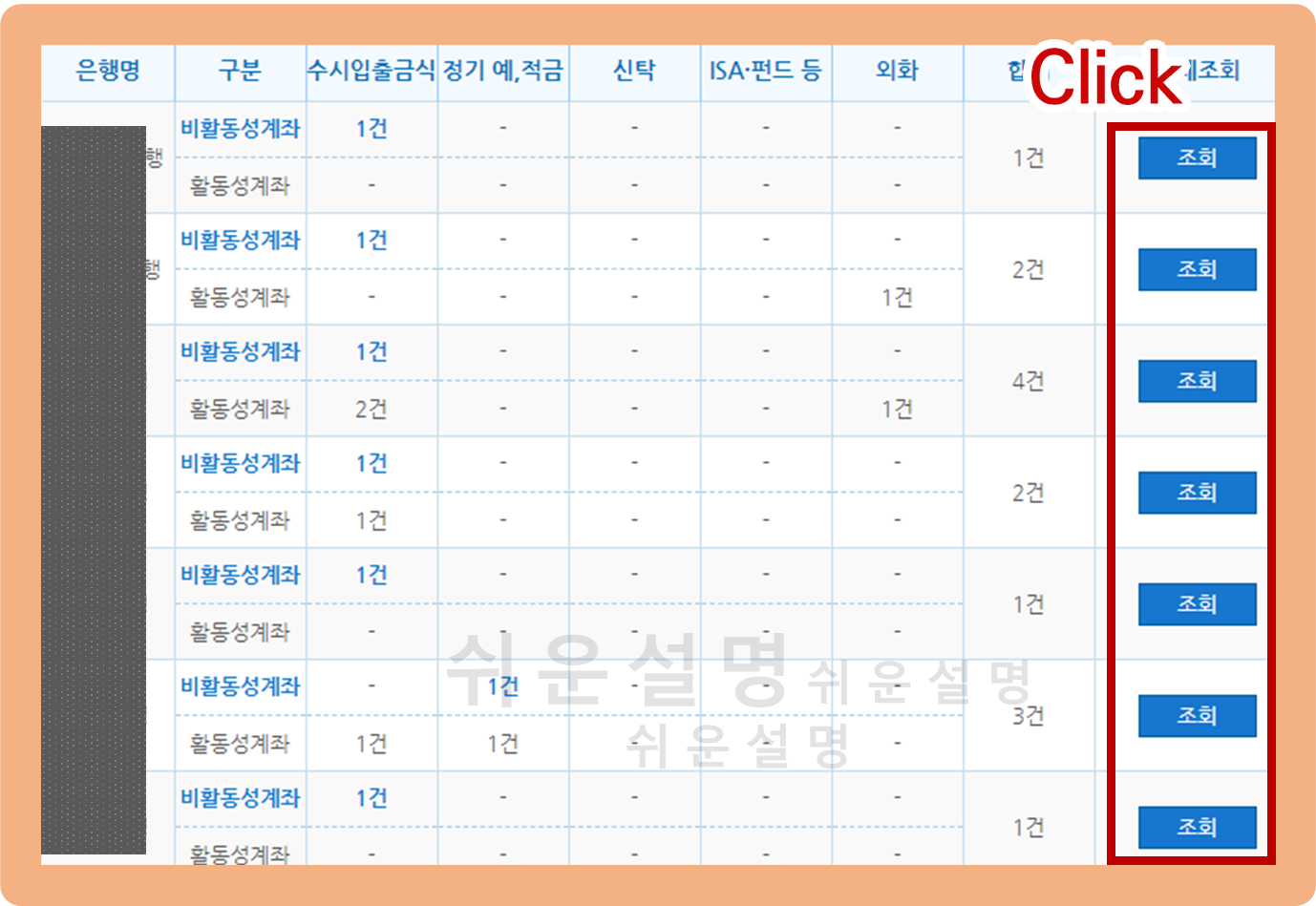 다음 화면에서는 여러분이 갖고 있는 전체 계좌 목록을 확인할 수 있는데요. 이 중 여러분이 조회를 원하는 은행 오른편에 보이는 '조회' 버튼을 클릭하면 해당 은행에 예금되어 있는 숨은 돈을 확인할 수 있어요.