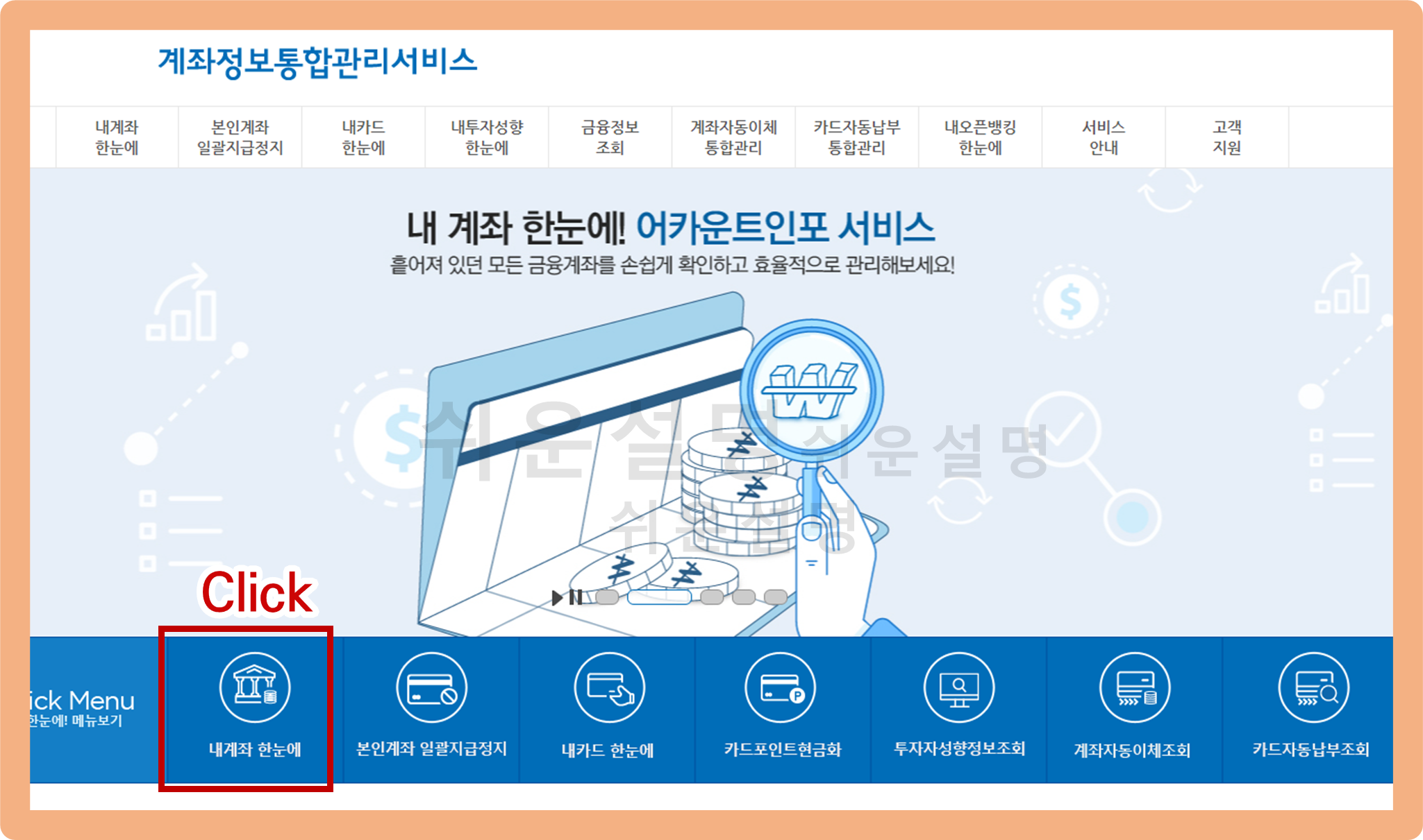 휴면계좌 조회 통합조회 시스템 - '내계좌 한눈에' 메뉴 클릭