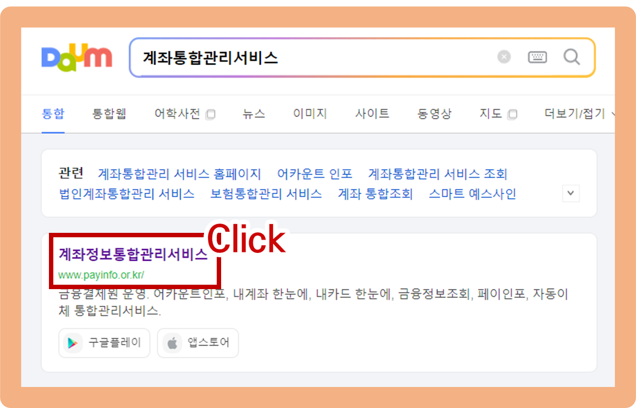 우선 검색창에 '계좌통합관리서비스' 라고 입력후 검색하시면, 맨 위에 '계좌정보통합관리서비스' 공식 홈페이지가 보이실 거에요. 이 곳을 클릭해서 접속해주시길 바랄게요.
