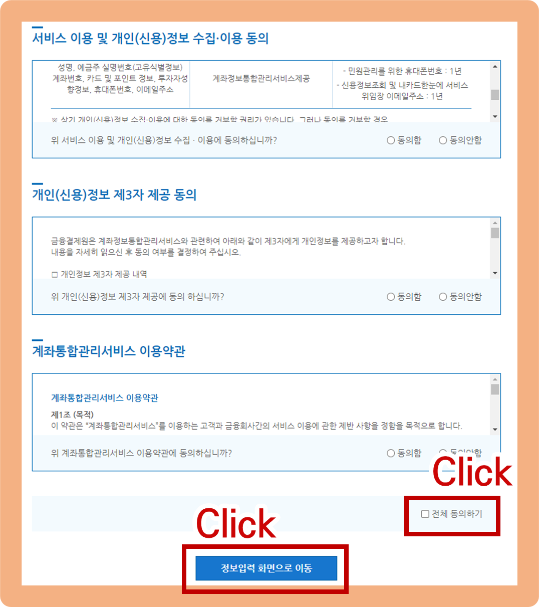 그 다음 서비스 이용, 개인 정보, 계좌통합관리서비스 이용 약관에 대해 전체 동의를 진행해주시구요. 화면 아래쪽에 보이는 '정보입력 화면으로 이동' 버튼을 클릭해주세요.