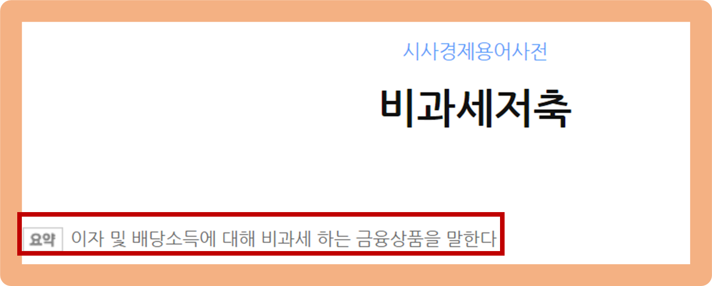 사전에 의미를 살펴보면, 이자 수익 및 배당 수익에 대해 비과세하는 금융 상품 이라고 정리 되어 있어요.