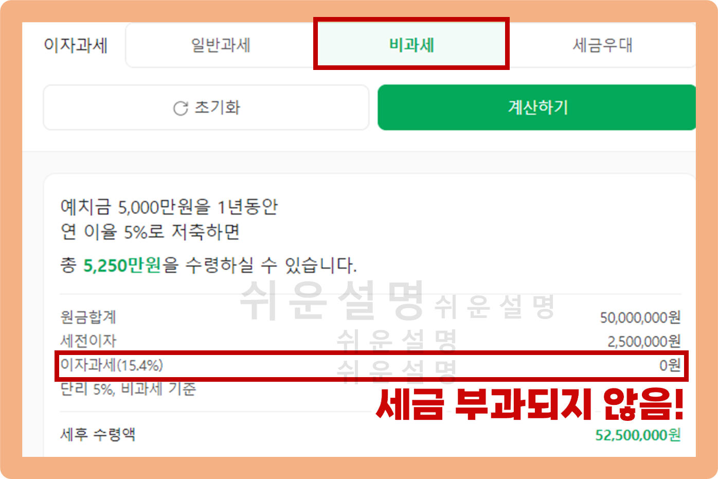 이번에는 동일한 상품을 비과세종합저축 가입을 통해 1년 동안 5천만원을 예치할 경우 이자 수익을 계산해볼게요.