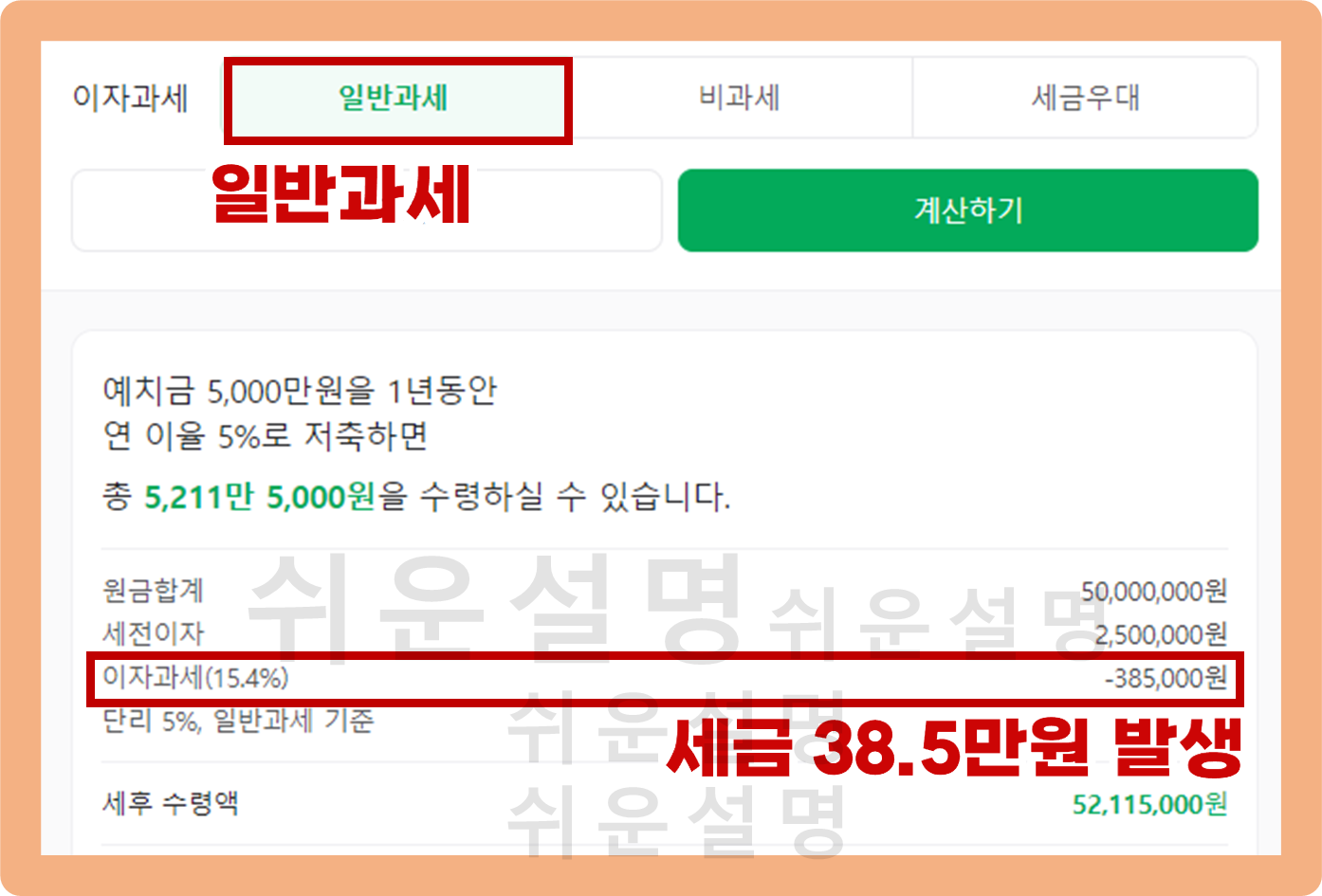 예시를 들기 위해 금리 5%의 예금 상품을 가입하여 1년 동안 원금 5천만원을 예치했을 때, 일반과세가 적용될 경우 만기 해지시 이자 수익을 알아볼게요.
