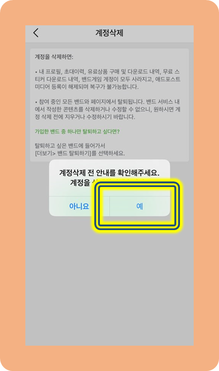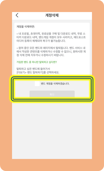 읽기를 마치셨으면 [밴드 계정을 삭제하겠습니다]를 체크하고 확인를 눌러주세요.