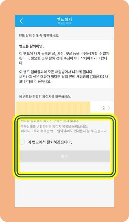 [이 밴드에서 탈퇴하겠습니다]라는 문구를 확인해 주신 후 체크해주세요.