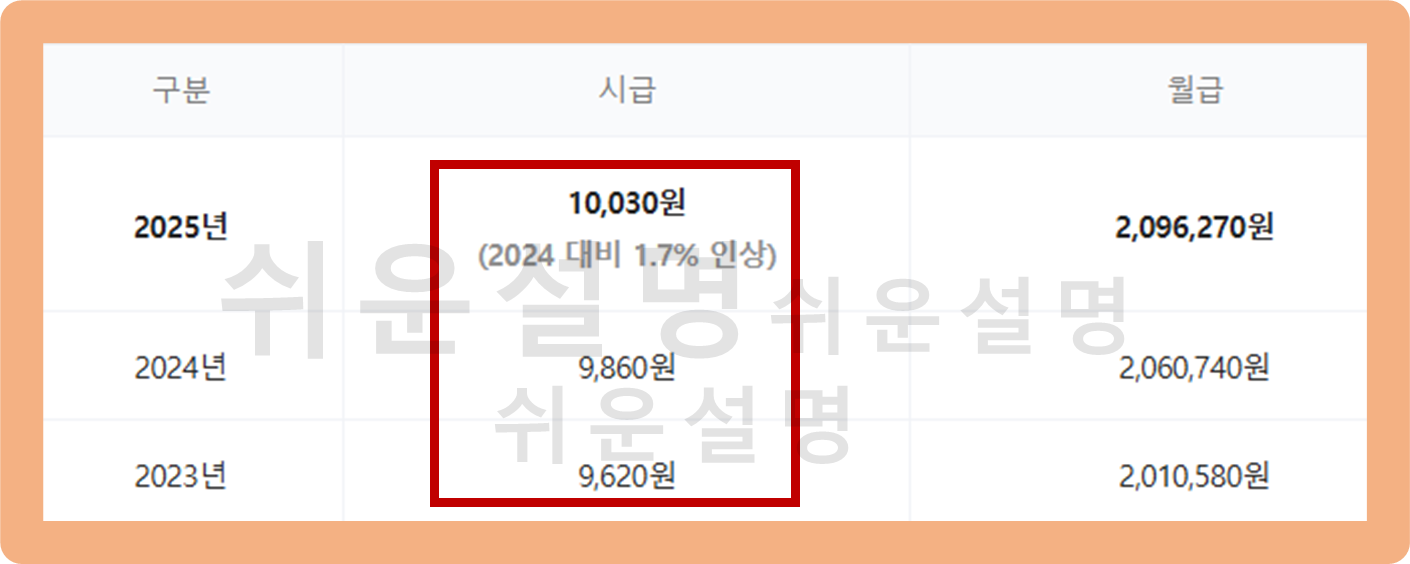 2025년 현재 최저시급은 10,030원으로 정해져 있으며, 이를 기준으로 월급으로 환산하면 약 209만원 수준이에요.