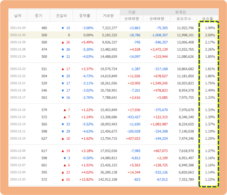 기관 및 외국인 보유율은 현재 2% 수준으로 한달 전보다 약 0.7~0.8% 상승한 수치입니다.