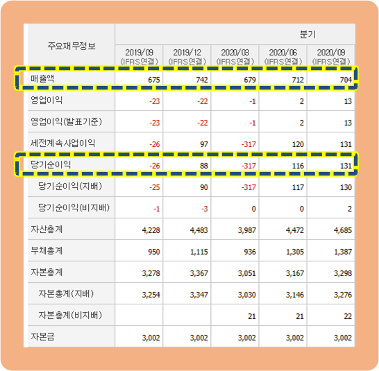 위에 보이는 표는 분기별 재무제표입니다.