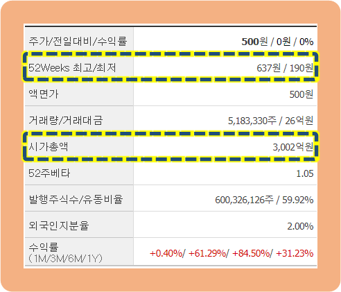 총 시가총액은 약 3,000억 원이고 발행주식수는 약 6억 주입니다.