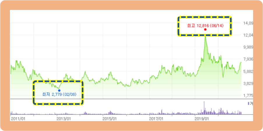 지난 10년간 주가 변동 추이를 살펴보면, 13년에는 최저점 2,779원이었고, 최고점은 19년 6월 12,816원이었습니다.