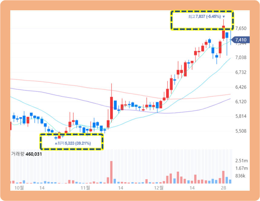 그런데 주가가 갑자기 계속 치솟으면서 20년 12월 28일에는 7,837원의 최고가를 기록했습니다.