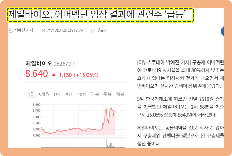 과학적으로 근거가 없는데 소문만으로 주가가 상승했었던 것입니다. 앞으로 이버멕틴이 치료의 핵심 성분으로 사용되면 제일바이오의 주가는 엄청 오르겠네요.