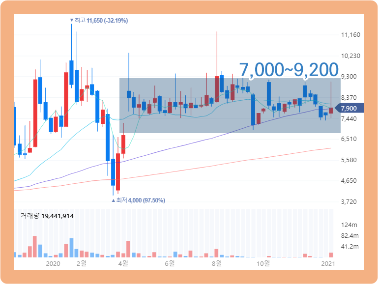 그 이후 지금은 7천원에서 9천2백원 사이 박스권 안에서 등락을 반복하고 있습니다.