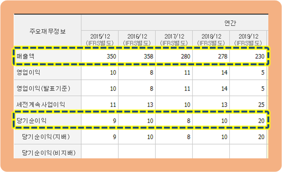 연간 재무정보를 살펴보면, 2016년까지 300억원에서 2017년 이후 200억원으로 매출이 감소했습니다.