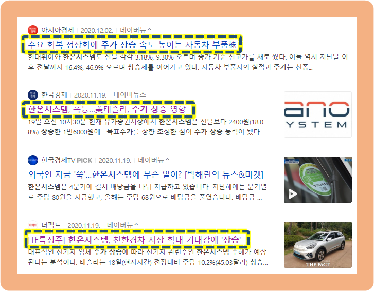 테슬라의 엄청난 주가 상승으로 인해, 관련 주식인 한온시스템이 주가에도 영향을 끼친 것입니다.