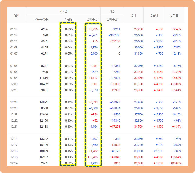 외국인의 주식 보유율은 약 0.1% 미만 수준에서 조금씩 등락하고 있습니다.