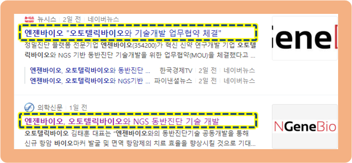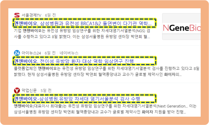 이번 연구에 참여한 엔젠바이오는 NGS 기반의 BRCA 정밀 진단 제품과 기술로 국내 최고의 유방암 전문가분들한테 인정을 받았다고 합니다.