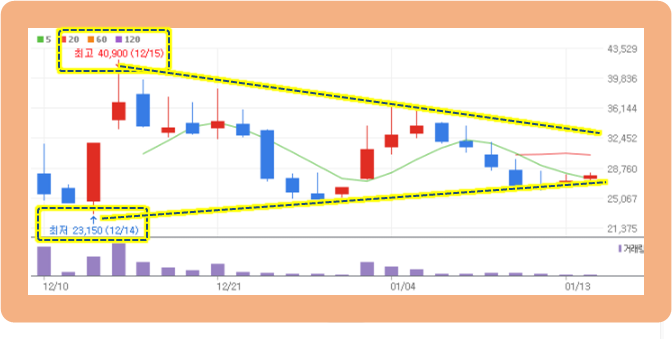 주가의 최저치는 23,150원이었고, 최고점은 그 다음날 40,900원까지 상승했었습니다.