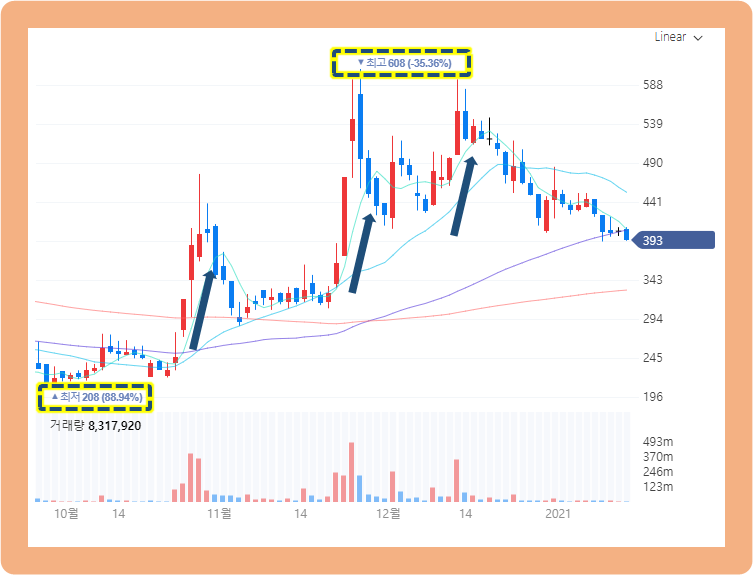 그런데 주가는 급등하더니 11월 25일경 3배나 증가한 608원을 기록했습니다.