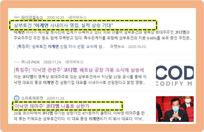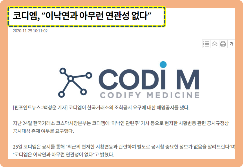 하지만 이 주가 급등에 대해 코디엠은 이낙연과는 아무 상관이 없다고 공시했었네요.