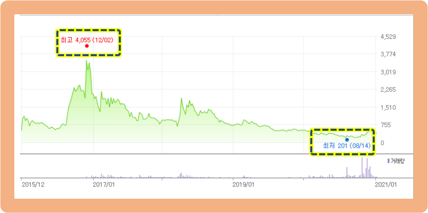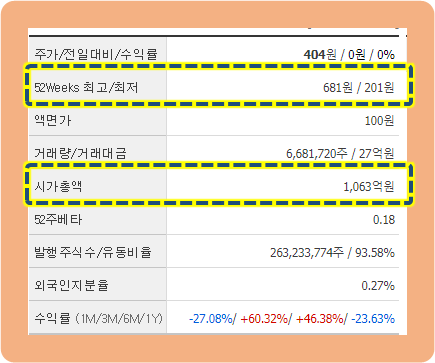 52주간 최저 201원, 최고 681원으로 무려 3배 이상 차이가 납니다.