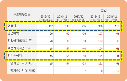 매출액 추이를 보시면, 2017년도에 735억 원으로 최고치에 달했었구요. 2019년 기준으로 현재 118억 원으로 6배에서 7배 정도 감소한 상황입니다.