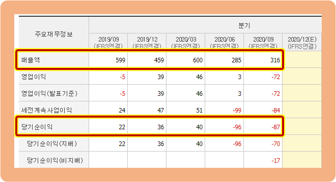 그 다음 분기인 2020년 2분기에는 매출액이 285억원으로 반토막나면서, 당기순이익도 -96억원으로 적자 전환하였습니다. 3분기에도 마찬가지로 당기순이익 연속 적자 이구요.