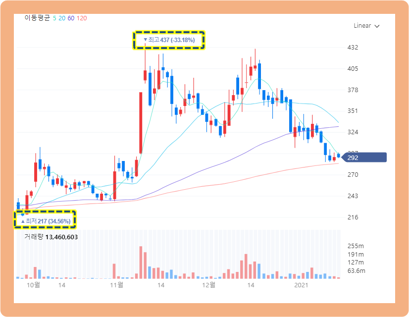 2020년 9월에는 주가가 200원이였는데, 11월부터 두 배 이상 오른 400원까지 찍었습니다.